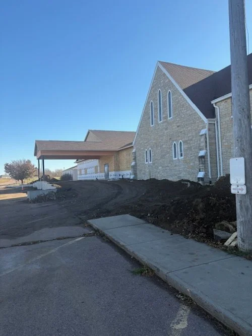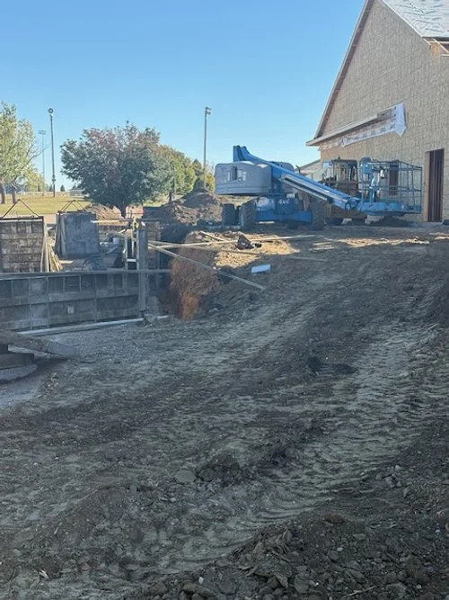 DIRT WORK FOR NEW BUILDING, THE OLD ELEVATOR REMOVED, TILE LAID FOR DRAINAGE, AND STONE FACADE REMOVED WHERE THE NEW ADDITION WILL ATTACH TO THE CHURCH